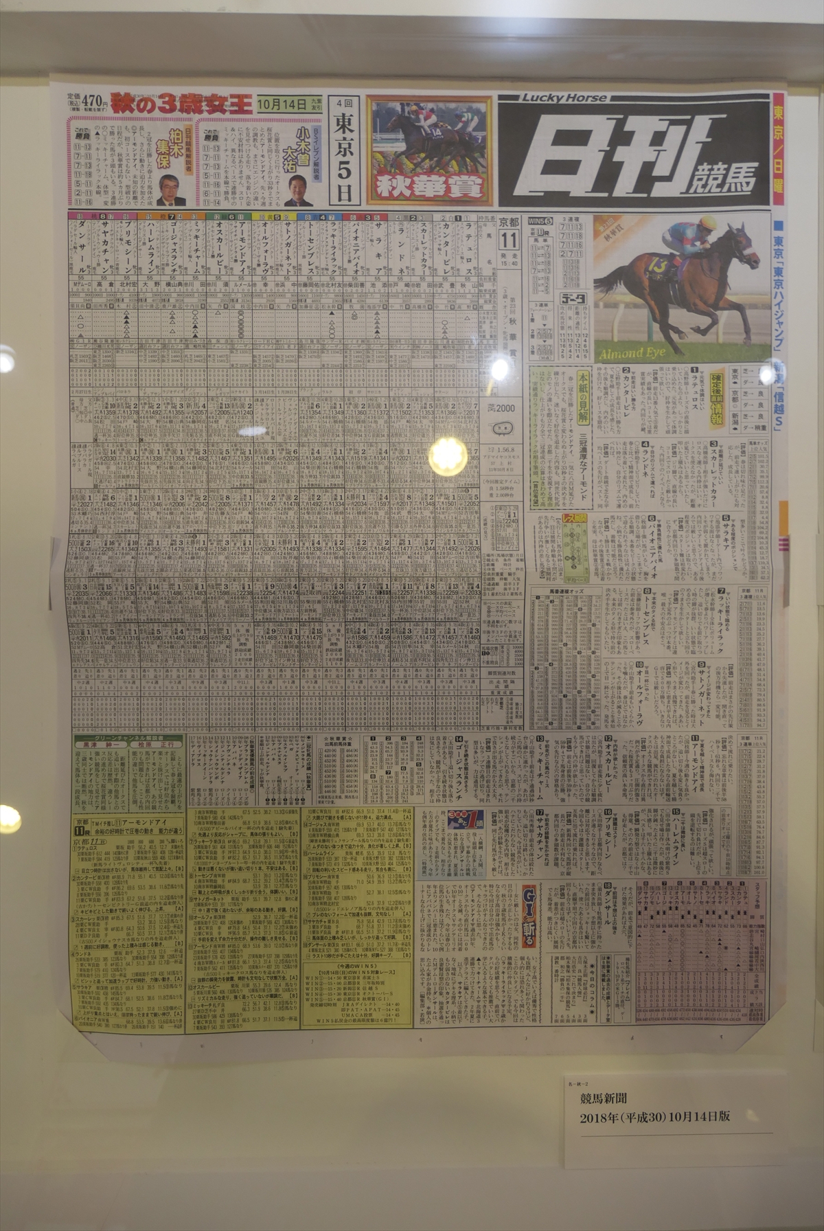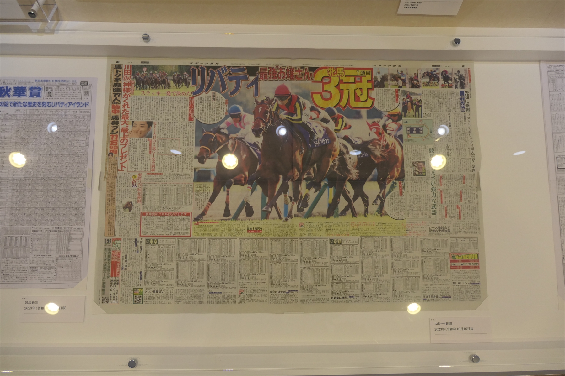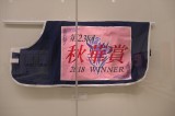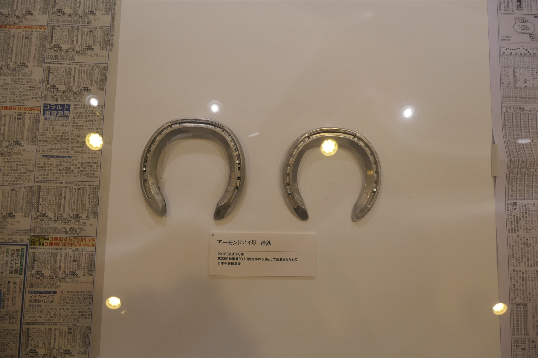 | 秋華賞。1位リバティアイランド | アーモンドアイの新聞と蹄鉄とゼッケンとレイ | |||